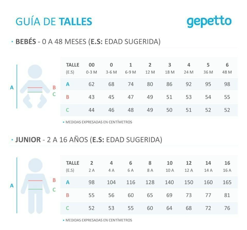 Talle 6: Largo 46 cm, Ancho 35